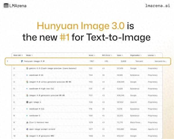 站长之家(ChinaZ.com)10月5日 消息:据AI文生图领域最具权威性的榜单LMArena最新公布,腾讯推出的混元图像3.0模型,在发布仅一周后便在全球26个顶尖大模型中脱颖而出,一举击败Nano、Banana等强劲对手,成功登顶榜首,成为AI生图领域的新王者。